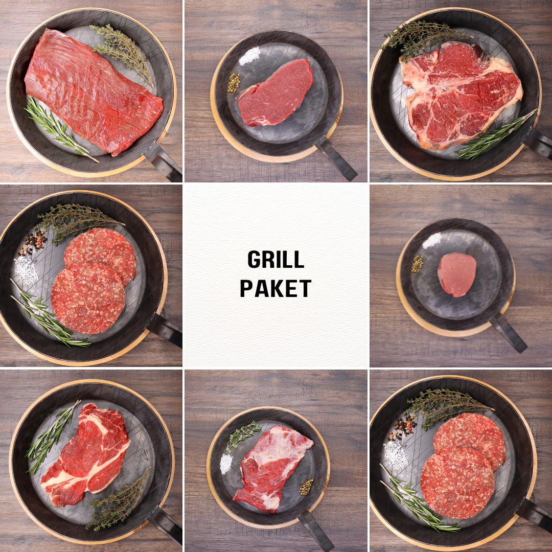 Das Grillpaket beinhaltet z.B folgende Artikel: T-Bone, Flank, Hüfte, Rolle, Picanha (Tafelspitz), Hochripp usw. + Burgerpatties